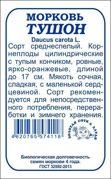 Сорт среднеспелый, урожайный. Розетка листьев полураскидистая. Корнеплоды ярко-оранжевого цвета, цилиндрические с тупым кончиком, ровные, длиной до 17 см. Мякоть сочная, нежная и сладкая, с маленькой сердцевиной и высоким содержанием каротина. Сорт рекомендуется для непосредственного потребления, переработки и зимнего хранения.