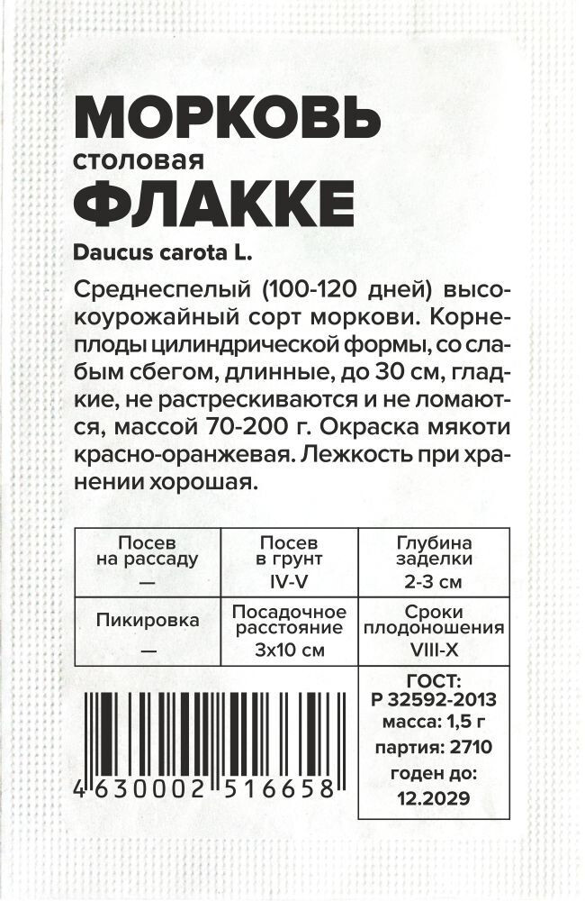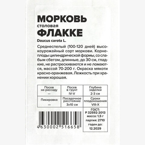 Среднеспелый (100-120 дней) высокоурожайный сорт моркови. Корнеплоды цилиндрической формы, со слабым сбегом, длинные, до 30 см, гладкие, не растрескиваются и не ломаются, массой 70-200 г. Окраска мякоти красно-оранжевая. Лежкость при хранении хорошая. Рекомендуется для весеннего и подзимнего сева. Содержание каротина до 20 мг/%. Особенность сорта — минимальное накопление нитратов. Место посадки: выровненные участки с рыхлой плодородной супесчаной или легкосуглинистой почвой Освещение: обильное, плохо переносит затенение Предпосевная подготовка: не требуется. Для более дружных всходов допускается на 15 минут замочить в воде температурой 50°С Сроки посева: сразу после оттаивания почвы (апрель-май), либо середина июня, либо осенью после промерзания грунта (сухим способом) Посев на рассаду: не предусмотрен Посев в грунт: за 1-2 дня до посева проводят обильный полив, рыхление и выравнивание почвы. Семена высевают в предварительно увлажненные борозды на глубину 1-2 см (чем больше в почве песка, тем глубже), оставляя междурядья 10 см и 3-4 см между растениями. Присыпают грунтом, хорошо уплотняют. После посева проводят еще один полив дождеванием. Для сохранения влажности почвы посевы накрывают агроволокном до появления всходов. Полив проводят поверх укрывного материала Пикировка/перевалка: не предполагается Уход: всходы прореживают на расстояние 3-4 см. Не выносит свежего навоза, при его внесении образует искривленные корнеплоды с множеством корней. На бедных почвах проводят подкормку азофоской в количестве 15г/10 л воды один раз в месяц Сбор урожая: август - октябрь