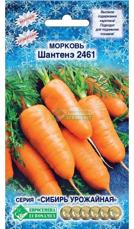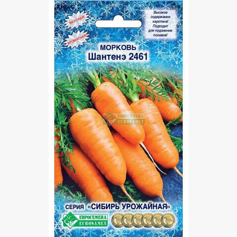 Морковь – старейшее овощное растение, которое употребляется людьми уже более 4 тысяч лет, она одна из самых популярных овощей у россиян. Ярко-оранжевый корнеплод растет практически в каждом огороде и продается в любом продуктовом магазине. Ее добавляют в супы, в десерты и даже в напитки. Такая всенародная любовь к моркови не случайна, ведь она - настоящий кладезь витаминов и полезных микроэлементов. Шантанэ 2461- среднеспелый сорт (сортотип Шантанэ). Период вегетации от всходов до получения готовой продукции 110-120 дней. Лист средней длины, светло-зеленый. Корнеплод короткий, конической формы, со слабым и слегка заостренным основанием, оранжевый, длиной 18-20 см, массой 110-200 г. Мякоть плотная, сочная, ароматная, с высоким содержанием каротина. Вкусовые качества высокие. Ценность сорта: устойчивость к засухе, стеблеванию и растрескиванию, хорошая лежкость, подходит для подзимних посевов. Используется в свежем виде и для кулинарной переработки.