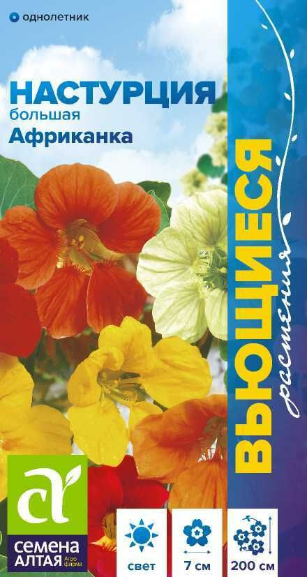 К обычным радостным оттенкам настурции прибавляется еще одна -очень редкая светло-зеленая окраска цветков. Особенно выигрышно это сочетание выглядит на фоне мраморной листвы. Побеги полустелющиеся, длиной до 2 м. Листья светло-зеленые с белым мраморным рисунком. Цветки различной яркой окраски: бело-зеленые, желтые, лимонные, оранжевые, красные. Широко применяется как для вертикального озеленения, так и в качестве почвопокровного растения. Тепло- и светолюбивое растение, не выносит даже лёгких заморозков. Предпочитает солнечные или слегка затененные участки на умеренно плодородных влажных почвах без избытка органических удобрений. Перед посевом семена желательно замочить в теплой воде на 24 часа. Посевы в открытый грунт проводят во второй половине мая сразу на постоянное место (по три семечка в лунку). Интервал между лунками 20-30 см, глубина заделки семян – 1,5-2 см. При температуре почвы +20°C всходы появляются на 14-20 день. Для получения более раннего цветения можно посеять семена на рассаду в начале апреля в торфяные горшочки, по 3-4 штуки (пикировку растение не переносит). После прорастания сеянцы переносят в помещение с температурой не выше +18°C, в более теплых условиях растения вытянутся и могут погибнуть. Высаживать рассаду в грунт следует в конце мая – начале июня вместе с торфяными горшочками. До начала цветения настурция нуждается в регулярном поливе и подкормках, затем частоту поливов сокращают. Цветение обильное и продолжительное – с июня до заморозков.