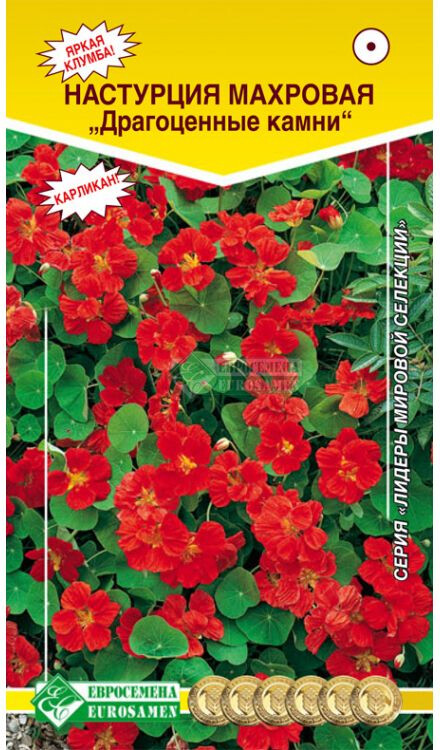 Подлинный шедевр среди настурций! Это новая махровая настурция, цветки которой ослепительно сияют, словно драгоценные камни ярко-красного цвета, с приятным ароматом, несомненно, просто очарует всех. Цветочки возвышаются над мелкой листвой и компактным кустиком, выглядят невероятно красиво и декоративно. Что же касается продолжительности цветения, то это растение не имеет себе равных и одновременно распускает 10-15 цветков. Станет великолепным украшением оконных ящиков, клумб и бордюров, во всех видах цветников.