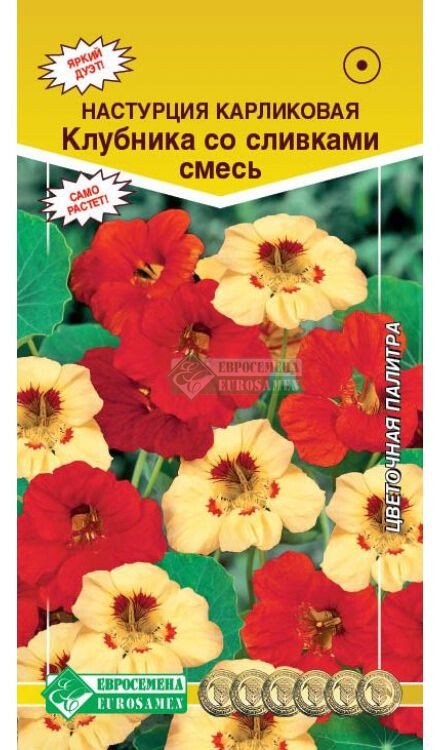 Настурция принадлежит к роду травянистых растений с южно-американскими корнями, ее можно встретить почти на каждом садовом участке. Несложные в уходе, яркие и радующие глаз цветы с целебными свойствами и неплохими вкусовыми качествами очень популярны среди любителей флоры. Цветки настурции приятно пахнут. Если нужно оформить участок, расположенный на солнцепеке, задекорировать глухую стену или забор, оформить балкон или террасу - обратите внимание на настурцию. Клубника со сливками -восхитительная смесь с эффектными цветками ярко-красного и нежнейшего кремового цвета. Цветочки возвышаются и лучатся, словно маленькие огоньки, над мелкой листвой и компактным кустиком, выглядят невероятно красиво и декоративно. Что же касается продолжительности цветения, то это растение не имеет себе равных и одновременно распускает 10-15 цветков. Высота растения-30 см Диаметр цветка-5см