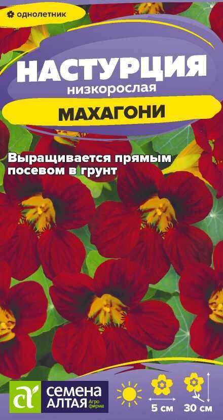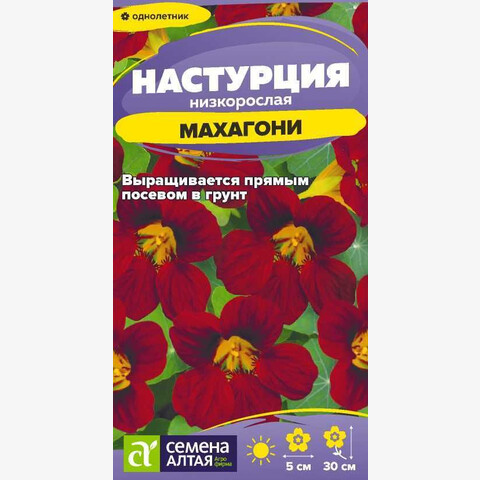 Роскошное растение для Вашего цветника. Отличается насыщенностью окраски и ярким внешним видом, способным привлечь внимание издалека. Куст шарообразный, высотой до 40 см, с крупными, диаметром до 5 см цветками цвета махагони, расположенными поверх темно-зеленых листьев. Выращивается в контейнерах и вазонах, в смешанных посадках на газонах и бордюрах, используется для оформления переднего плана цветников, балконов. Органично впишется в различные садовые композиции, придаст яркий акцент любому уголку сада. Тепло- и светолюбивое растение, не выносит даже лёгких заморозков. Предпочитает солнечные или слегка затененные участки на умеренно плодородных влажных почвах без избытка органических удобрений. Перед посевом семена желательно замочить в теплой воде на 24 часа. Посевы в открытый грунт проводят во второй половине мая сразу на постоянное место (по три семечка в лунку). Интервал между лунками 20-30 см, глубина заделки семян – 1,5-2 см. При температуре почвы +20°C всходы появляются на 14-20 день. Для получения более раннего цветения можно посеять семена на рассаду в начале апреля в торфяные горшочки, по 3-4 штуки (пикировку растение не переносит). После прорастания сеянцы переносят в помещение с температурой не выше +18°C, в более теплых условиях растения вытянутся и могут погибнуть. Высаживать рассаду в грунт следует в конце мая – начале июня вместе с торфяными горшочками. До начала цветения настурция нуждается в регулярном поливе и подкормках, затем частоту поливов сокращают. Цветение обильное и продолжительное – с июня до заморозков.