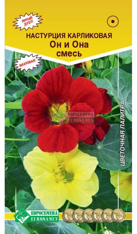 Настурция принадлежит к роду травянистых растений с южно-американскими корнями, ее можно встретить почти на каждом садовом участке. Несложные в уходе, яркие и радующие глаз цветы с целебными свойствами и неплохими вкусовыми качествами очень популярны среди любителей флоры. Цветки настурции приятно пахнут. Если нужно оформить участок, расположенный на солнцепеке, задекорировать глухую стену или забор, оформить балкон или террасу - обратите внимание на настурцию. Он и Она -восхитительная смесь с эффектными цветками темно-коричневого и нежнейшего желтого цвета. Цветочки возвышаются и лучатся, словно маленькие огоньки, над мелкой листвой и компактным кустиком, выглядят невероятно красиво и декоративно. Что же касается продолжительности цветения, то это растение не имеет себе равных и одновременно распускает 10-15 цветков. Высота растения-25 см Диаметр цветка-5 см