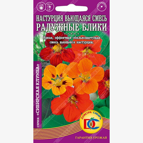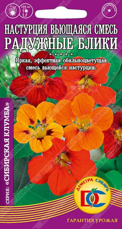 Яркая, эффектная обильноцветущая смесь вьющейся настурции, с полустелющимися плетьями длиной до 1.5 м. Цветки крупные до 7 см в диаметре, многокрасочные, махровые со шпорцами, словно огоньки будут загораться на фоне сочной зелени листьев. Это неприхотливое, декоративное растение с легкостью украсит балконы, клумбы, рабатки. и наполнит воздух приятным ароматом.