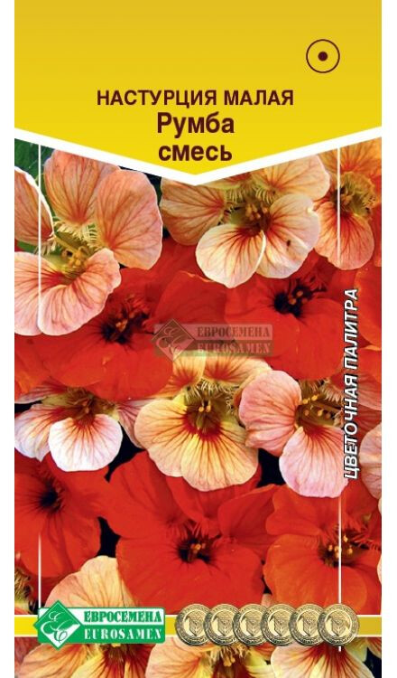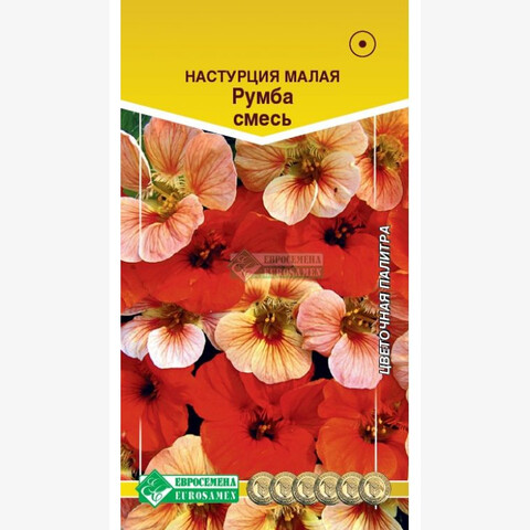 Настурция принадлежит к роду травянистых растений с южно-американскими корнями, ее можно встретить почти на каждом садовом участке. Несложные в уходе, яркие и радующие глаз цветы с целебными свойствами и неплохими вкусовыми качествами, очень популярны среди любителей флоры. Цветки настурции приятно пахнут. Если нужно оформить участок, расположенный на солнцепеке, задекорировать глухую стену или забор, оформить балкон или террасу - обратите свое внимание на данную культуру. Румба - восхитительная смесь настурции с эффектными цветками темно-красного и лососевого цветов. Цветочки возвышаются и лучатся, словно маленькие огоньки, над мелкой листвой и компактным кустиком, выглядят невероятно красиво и декоративно. Что же касается продолжительности цветения, то это растение не имеет себе равных и одновременно распускает по 10-15 цветков.