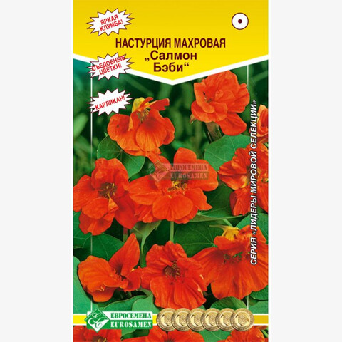 Подлинный шедевр среди настурций! Восхитительная окраска махровых цветков лососевого цвета и приятный аромат этой низкорослой красавицы просто очаруют Вас. Цветочки возвышаются над мелкой листвой и компактным кустиком, выглядят невероятно красиво и декоративно. Что же касается продолжительности цветения, то это растение не имеет себе равных и одновременно распускает 10-15 цветков. Станет великолепным украшением оконных ящиков, клумб и бордюров, во всех видах цветников.