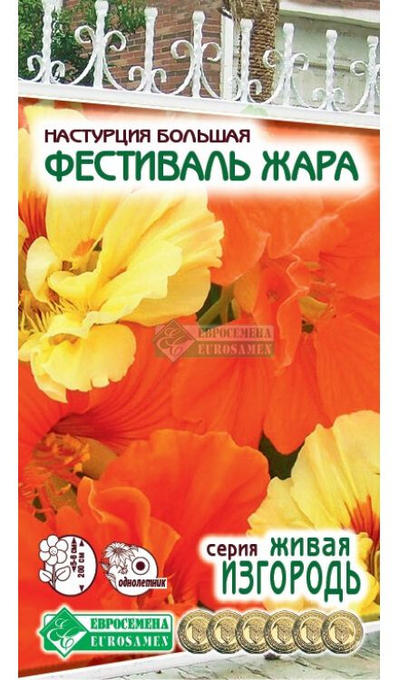 Настурция — однолетнее травянистое растение семейства Настурциевые родом из Центральной и Южной Америки. Она особенно популярна среди садоводов, так как достаточно неприхотлива к условиям окружающей среды, ее просто выращивать, она красиво и долго цветет. У нее яркие, привлекающие внимание, цветки, изысканные и яркие. Ее трудно спутать с какими-либо другими видами декоративных растений. Фестиваль Жара - сорт настурции с гибкими и длинными, забирающимися вверх, побегами длиной до 2-х метров. Цветет обильно с июня до заморозков. Отличный медонос! Ее можно посадить как в саду, на огороде, так и в домашних условиях: на балконе или в ящиках на подоконнике. Настурция или капуцин хорошо зарекомендовала себя и как декоративное, и как лекарственное растение, ее используют в кулинарии: листья добавляют в салаты, маринуют, а цветками украшают салаты.
