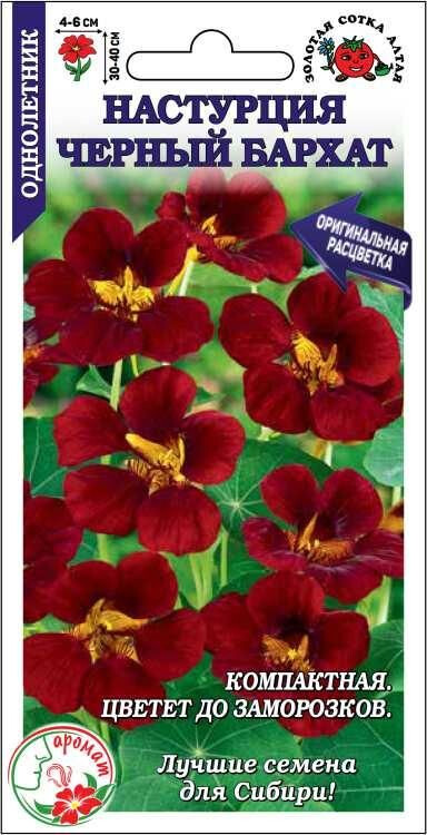 Оригинальный сорт с бархатистыми темно-бордовыми цветами, эффектно выделяющимися на фоне ярко-зеленой листвы. Кустик компактный, с большим количеством ветвистых побегов. Аромат приятный. Обильно цветет до заморозков. Используют для оформления цветников и контейнеров. Цветами украшают салаты, листья хороши в холодных закусках, а маринованные бутоны заменяют каперсы.