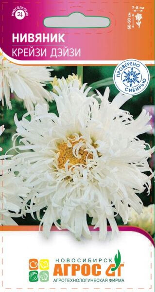 Многолетнее корневищное растение. Безумная ромашка – так в переводе звучит название этого сорта. Стебли крепкие прямостоячие. Цветок махровый, похож на хризантему, 7-8 см в диаметре. Лепестки сильно рассеченные, белые, хаотично расположены вокруг желтого центра. Предпочитает открытые солнечные места и удобренную, достаточно влажную почву. Нивяник отзывчив на полив и подкормки. После цветения цветоносы с соцветиями обрезают. Семена на рассаду высевают в марте-апреле или в мае в открытый грунт. Температура необходимая для прорастания семян +18 °С. Всходы появляются через 14-20 дней. Возможен подзимний посев. Первое время при сухой погоде нуждаются в поливе. Ромашки декоративны и придают цветнику особый колорит, ощущение домашнего тепла и уюта. Хорошо смотрятся в групповых посадках на фоне декоративных кустарников, в рабатках и миксбордерах. Незаменимое растение для оформления букетов. 60-90 III-IV V, IX-X V-VI 40x40 VI-VII