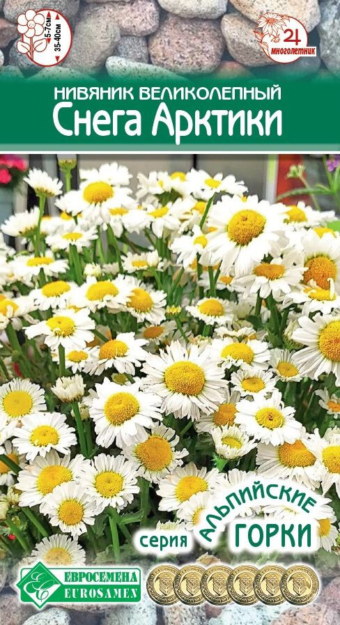 Трудно представить свой сад без нивяника (официальное название – леукантемум, народное название – садовая ромашка). Трогательный внешний вид сделал нивяник, пожалуй, одной из самых широко распространённых цветочных культур. За многие годы сложилось впечатление, что любителей садовых ромашек больше привлекают высокорослые сорта с крупными или махровыми цветами, но в последнее время садоводов все больше привлекают сорта, способные удивлять своей компактностью, выровненным габитусом и не требующие яровизации. Снега Арктики- многолетник, зацветающий в год посева, с компактным, прямостоячим габитусом, хорошо ветвящийся и образующий множество белых цветков с желтой серединкой. Это классический нивяник, соответствующий всем представлениям о том, как должна выглядеть идеальная ромашка. Соцветия прекрасно чувствуют себя и в саду и при выращивании в домашних условиях.