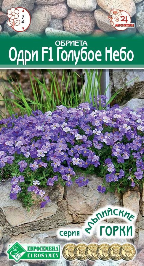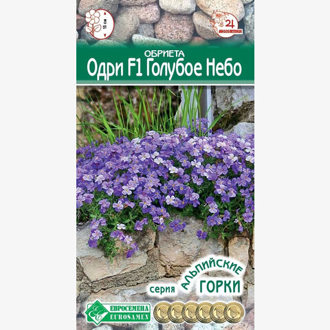 Обриета – травянистый многолетник с вечнозелеными листиками, который способен удивительным образом преобразовать ваш дачный участок, создать его неповторимый колорит. Красиво смотрится в цветниках, декорированных природными камнями, обриета может выращиваться в качестве балконной культуры и без проблем уживается со всеми цветущими соседями на участке. Второе название обриеты – аубреция. Цветки у аубреции некрупные, но их численность впечатляет. Обриета Одри- первый и единственный гибрид в своем сегменте, однородный по габитусу и интенсивности окраски. Это почвопокровное растение, создающее насыщенные небесно-голубые ковры из простых и многочисленных цветков. Куртина приземистая и в высоту вместе с цветоносами достигает всего 15 см, а в ширину около 35 см. Она растет быстро, поэтому ее так любят цветоводы. Цветет обильно с мая по июль и имеет возможность повторить цветение после перерыва, но уже не столь сильное. В этот период концы стеблей украшают соцветия в форме некрупных метелок, состоящих из 3-4 цветков.
