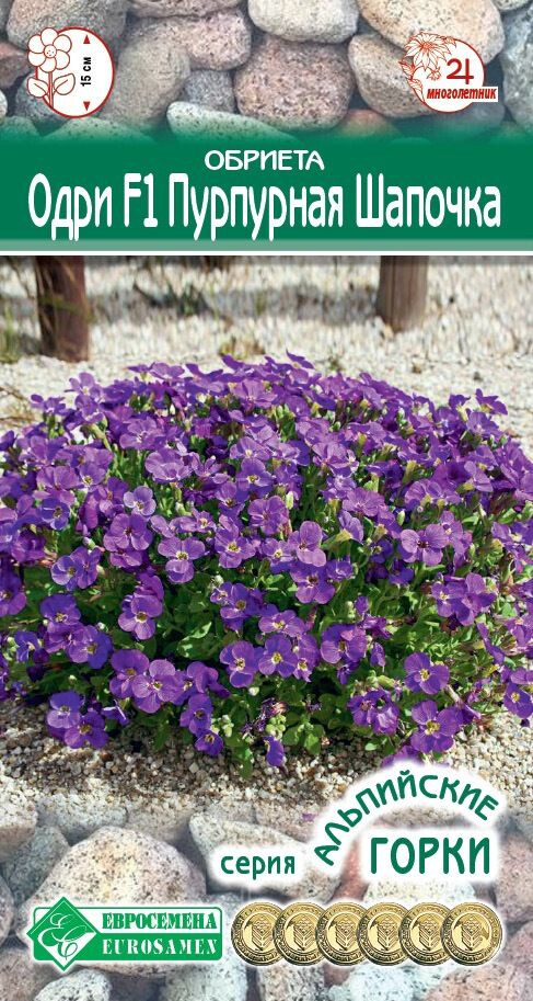 Обриета – травянистый многолетник с вечнозелеными листиками, который способен удивительным образом преобразовать ваш дачный участок, создать его неповторимый колорит. Красиво смотрится в цветниках, декорированных природными камнями, обриета может выращиваться в качестве балконной культуры и без проблем уживается со всеми цветущими соседями на участке. Второе название обриеты – аубреция. Цветки у аубреции некрупные, но их численность впечатляет. Обриета Одри- первый и единственный гибрид в своем сегменте, однородный по габитусу и интенсивности окраски. Это почвопокровное растение, создающее насыщенные пурпурно-фиолетовые ковры из простых и многочисленных цветков. Куртина приземистая и в высоту вместе с цветоносами достигает всего 15 см, а в ширину около 35 см. Она растет быстро, поэтому ее так любят цветоводы. Цветет обильно с мая по июль и имеет возможность повторить цветение после перерыва, но уже не столь сильное. В этот период концы стеблей украшают соцветия в форме некрупных метелок, состоящих из 3-4 цветков.