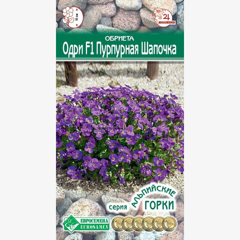 Обриета – травянистый многолетник с вечнозелеными листиками, который способен удивительным образом преобразовать ваш дачный участок, создать его неповторимый колорит. Красиво смотрится в цветниках, декорированных природными камнями, обриета может выращиваться в качестве балконной культуры и без проблем уживается со всеми цветущими соседями на участке. Второе название обриеты – аубреция. Цветки у аубреции некрупные, но их численность впечатляет. Обриета Одри- первый и единственный гибрид в своем сегменте, однородный по габитусу и интенсивности окраски. Это почвопокровное растение, создающее насыщенные пурпурно-фиолетовые ковры из простых и многочисленных цветков. Куртина приземистая и в высоту вместе с цветоносами достигает всего 15 см, а в ширину около 35 см. Она растет быстро, поэтому ее так любят цветоводы. Цветет обильно с мая по июль и имеет возможность повторить цветение после перерыва, но уже не столь сильное. В этот период концы стеблей украшают соцветия в форме некрупных метелок, состоящих из 3-4 цветков.