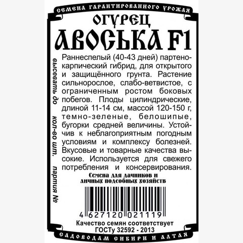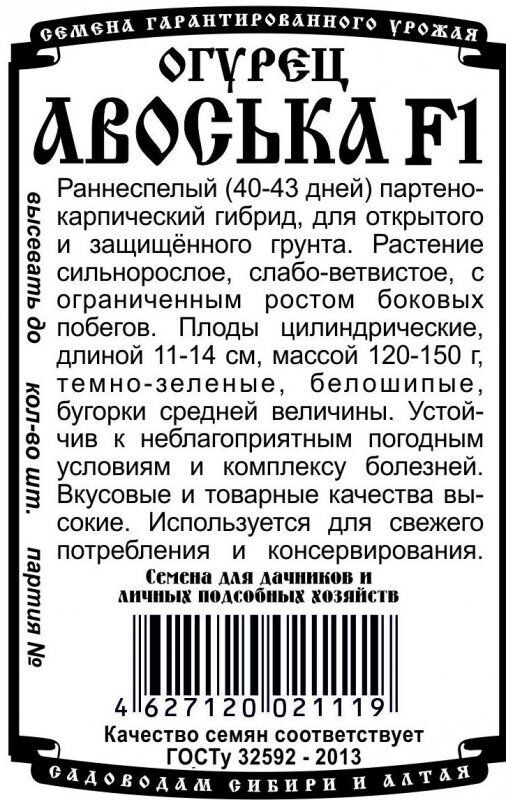 Раннеспелый (40-43 дня) партенокарпический гибрид (R), для открытого и защищённого грунта. Растение сильнорослое, слабоветвистое, с ограниченным типом роста боковых побегов. В узле формируется 2-3 завязи. Плоды цилиндрические длиной 11-14 см, массой 120-150 г, темно-зеленые, белошипые, бугорки средней величины. Устойчив к основным заболеваниям и хорошо адаптируется к любым условиям выращивания. Вкусовые и товарные качества высокие. Используется для свежего потребления и консервирования.