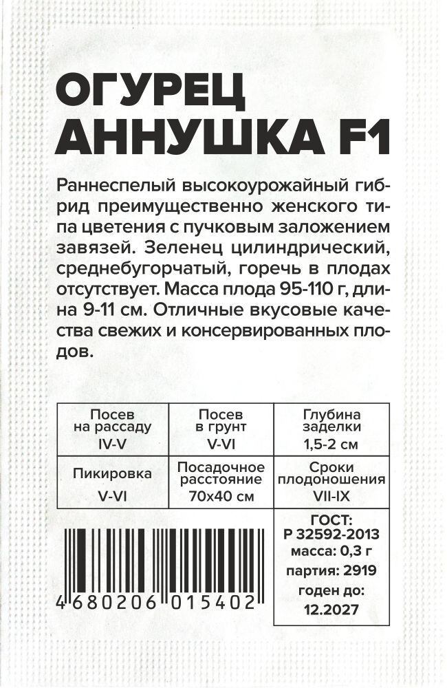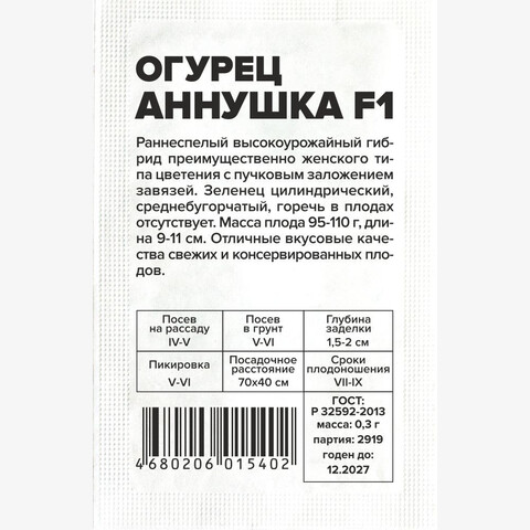 Раннеспелый высокоурожайный пчелоопыляемый гибрид преимущественно женского типа цветения с пучковым заложением завязей. Зеленец цилиндрический, среднебугорчатый, горечь в плодах отсутствует. Масса плода 95-110 г, длина 9-11 см. В пазухах листьев образуется по 2-3 завязи. Отличные вкусовые качества. Предназначен для потребления в свежем виде и для консервирования. Место посадки: предпочитает плодородные рыхлые нейтральные почвы. Размещают после капусты, лука, бобовых. Не рекомендуется сеять после других растений семейства тыквенных (тыква, огурец, кабачок, арбуз) Освещение: обильное, переносит легкое затенение Предпосевная подготовка: семена замачивают в 0,5% растворе марганцовки на 15 минут. Допускается предварительное проращивание во влажной ткани или посев сухими семенами без подготовки. Инкрустированные (цветные) семена сеют сухим способом, без замачивания и подготовки Сроки посева: на рассаду за 20-25 дней до высадки (апрель-май), в открытый грунт после прогревания почвы до 15..18°С на глубине 15 см (май-июнь) Посев на рассаду: семена раскладывают на выровненный уплотненный теплый очень влажный грунт в рассадные ящики или индивидуальные емкости объемом 0,5 л. Присыпают слоем почвы 0,8-1 см и хорошо уплотняют, аккуратно поливают теплой водой, накрывают пленкой. Пророщенные семена присыпают рыхлым грунтом без уплотнения Посев в грунт: высевают, когда почва прогреется до 15-20°С. Семена раскладывают на уплотненной и хорошо увлажненной почве, заделывают землей на глубину 1,5-2,0 см, хорошо увлажняют, уплотняют и накрывают пленкой Пикировка/перевалка: высадка проводится в открытый грунт или хорошо проветриваемые теплицы с доступом насекомых – опылителей. Схема посадки 70х40 см Уход: растения прищипывают после 5-7 настоящего листа. Почва под растениями всегда должна оставаться увлажненной. Подкормки проводят при наличии симптомов дефицитов питания. При выращивании в теплице необходимо обеспечивать проветривание