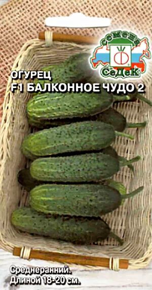 Семена огурец Балконное чудо 2. Среднеранний (45-50 дней) партенокарпический гибрид порадует Вас высоким урожаем в теплицах, а также на лоджиях, балконах и в зимнем саду. Зеленцы цилиндрические, среднебугорчатые, темно-зеленые, с белым опушением, длиной 18-20 см., массой 170-190 гр., отличного вкуса, без горечи. Урожайность 10-12 кг. Ценность гибрида : устойчивость к мучнистой росе, выносливость к пониженным температурам, теневыносливость и высокая степень партенокарпии, обильное плодоношение. Назначение универсальное.