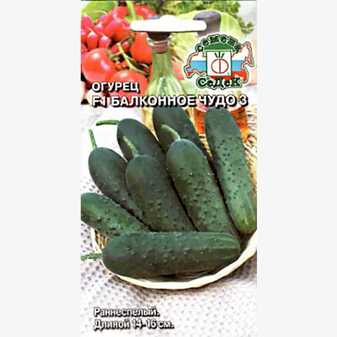 Семена огурец Балконное чудо 3 F1. Раннеспелый (43-45 дней) партенокарпический гибрид для пленочных укрытий и открытого грунта. Растение среднерослое, плетистое. В узле формируется 1-2 завязи. Зеленцы темно-зеленые, цилиндрические, крупнобугорчатые, со средним расположением бугорков, длиной 14-16 см., плотные, хрустящие, ароматные.