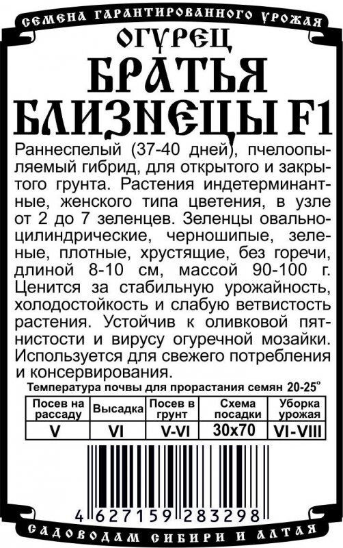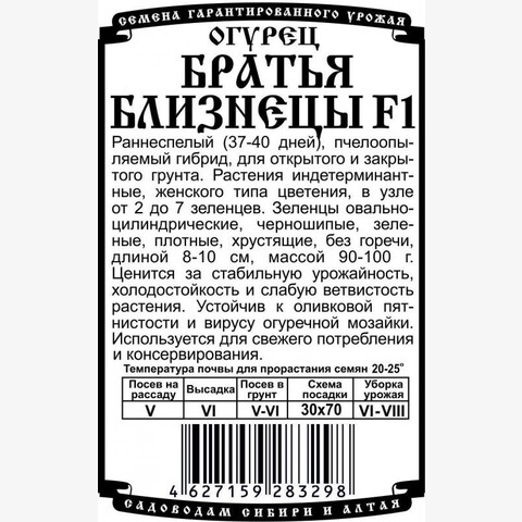 Раннеспелый (37-40 дней), пчелоопыляемый гибрид, для открытого и закрытого грунта. Растения индетерминантные, женского типа цветения, в узле от 2до 7 зеленцев. Зеленцы овально-цилиндрические, черношипые, зеленые, плотные, хрустящие, без горечи, длиной 8-10 см, массой 90-100г. Ценится за стабильную урожайность, холодостойкость и слабую ветвистость растения. Устойчив к оливковой пятнистости и вирусу огуречной мозайки. Используется для свежего потребления и консервирования.