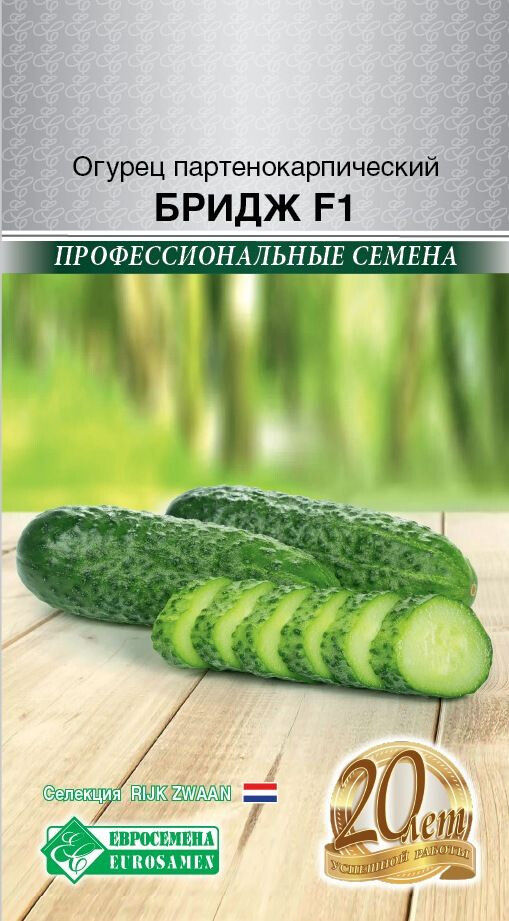 Огурец – ценный низкокалорийный продукт (14 ккал на 100 г). Витаминная составляющая овоща не очень выразительна. Большая часть ингредиентного состава приходится на воду (95 %), в которой находится природный адсорбент, впитывающий и выводящий яды из организма. Это натуральное очищающее вещество, по спектру действия напоминающее активированный уголь. Бридж - раннеспелый партенокарпический гибрид огурца, отличается хорошим здоровьем до конца сезона. Зеленец короткий, 8-12 см, цилиндрический, тёмно-зелёный с короткими полосами, крупнобугорчатый. Вкус превосходный, для свежего потребления и любых видов домашних заготовок. Гибрид высокоурожайный, закладывает 1-2 плода в узле.