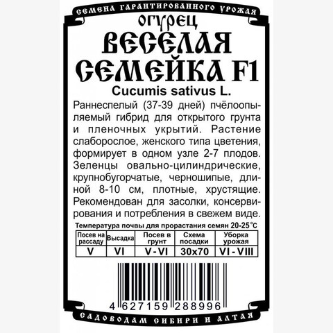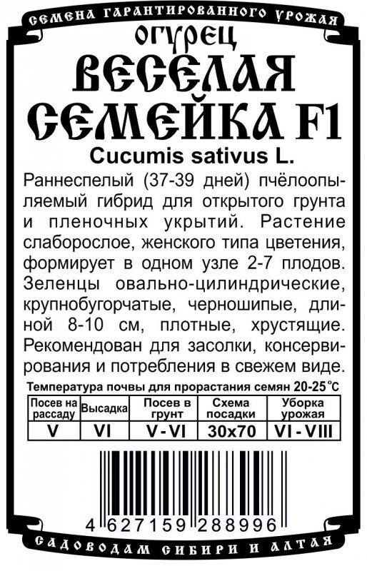 Раннеспелый (37-39 дней) пчёлоопыляемый гибрид для открытого грунта и пленочных укрытий. Растение слаборослое, женского типа цветения, формирует в одном узле 2-7 плодов. Зеленцы овально-цилиндрические, крупнобугорчатые, черношипые, длиной 8-10 см, плотные, хрустящие. Рекомендован для засолки, консервирования и потребления в свежем виде.