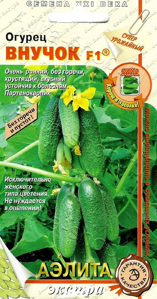 Очень ранний партенокарпический гибрид для открытого грунта, пленочных и стеклянных теплиц, женского типа цветения (ранее в описании: «самоопыляемый», правильный термин: «партенокарпический» - завязывает плоды без опыления). Отличительные свойства: увеличенный период плодоношения, высокая урожайность и товарность плодов. Устойчив к основным болезням огурца: вирусу огуречной мозаики, настоящей мучнистой росе, оливковой пятнистости, корневым гнилям, толерантен к ложной мучнистой росе. Растение среднеплетистое. Зеленцы корнишонного типа с маленькими семенными камерами, мелко-бугорчатые, с белым, плотным опушением, овально-цилиндрической формы, крепкие, хрустящие. Масса зеленца 63-76 г, длина 7,5-9,0 см, соотношение длины к диаметру 3,1:1. Отличается великолепными вкусовыми качествами в свежем виде, при консервировании и засолке. Горечи не содержит. Компания «АЭЛИТА» является эксклюзивным продавцом гибрида огурца «Внучок F1»® на рынке семян.