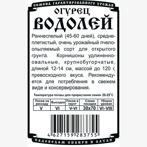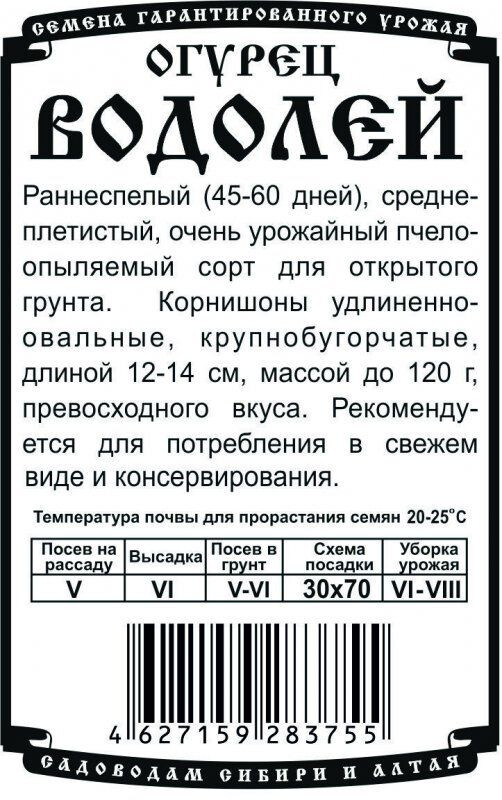 Раннеспелый (45-60 дней), среднеплетистый, очень урожайный пчелоопыляемый сорт для открытого грунта. Корнишоны удлиненно-овальные, крупнобугорчатые, длиной 12-14 см, массой до 120 г, превосходного вкуса. Рекомендуется для потребления в свежем виде и консервирования.