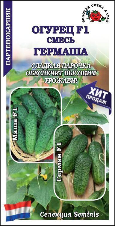 Смесь популярных и любимых многими садоводами гибридов. Ранние, самоопыляемые и транспортабельные, дают богатый и стабильный урожай товарных корнишонов в открытом и защищенном грунте. Зеленцы красивые, крупнобугорчатые, темно-зеленого цвета, длиной 8-11 см (Маша F1) и 10-12 см (Герман F1), плотные, сочные и хрустящие, великолепного вкуса, без горечи. Гибриды используются в свежем виде, для засола, маринования и приготовления малосольных огурчиков.