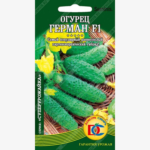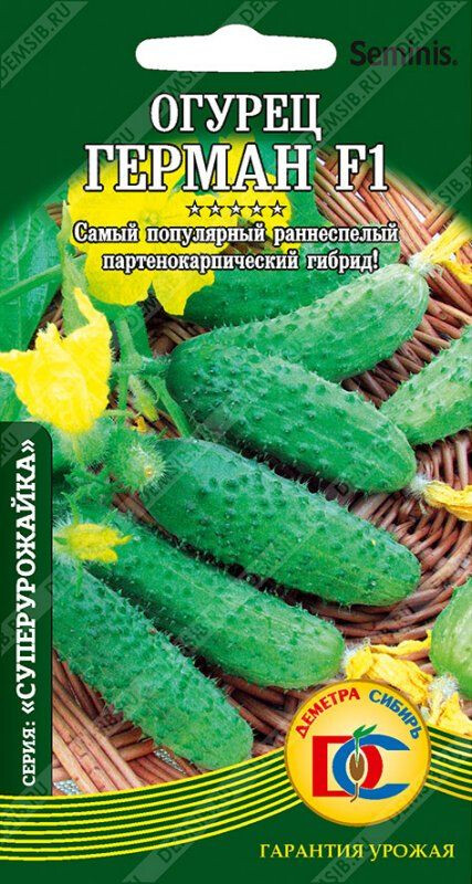 Герман F1 - один из самых популярных партенокарпических гибридов с пучковым образованием завязи. Сочетает очень раннее созревание (35-40 дней), холодостойкость и высокую урожайность. Плоды цилиндрической формы, крупнобугорчатые, темно-зеленого цвета, длиной 7-12 см, плотные, хрустящие, без горечи, отличного вкуса. Пригоден для засолки и потребления в свежем виде.