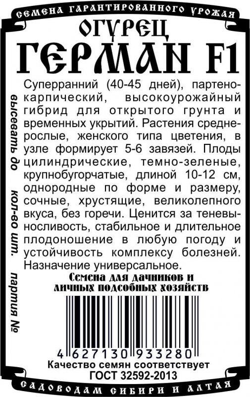 Суперранний (40-45 дней), партенокарпический, высокоурожайный гибрид для открытого грунта и временных укрытий. Растения среднерослые, женского типа цветения, в узле формирует 5-6 завязей. Плоды цилиндрические, темно-зеленые, крупнобугорчатые, длиной 10-12 см, однородные по форме и размеру, сочные, хрустящие, великолепного вкуса, без горечи. Ценится за теневыносливость, стабильное и длительное плодоношение в любую погоду и устойчивость комплексу болезней. Назначение универсальное.