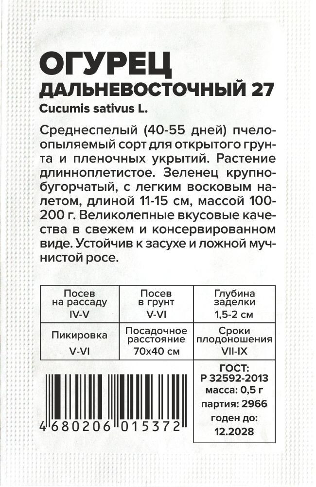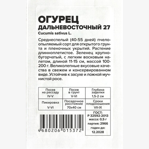 Замечательный среднеспелый (40-55 дней) засолочный сорт для открытого грунта и пленочных укрытий, пчелоопыляемый. Растение длинноплетистое. Зеленец цилиндрический, крупнобугорчатый, с легким восковым налетом, длиной 11-15 см, массой 100-200 г. Великолепные вкусовые качества, как в свежем, так и в консервированном виде. Сорт устойчив к засухе и ложной мучнистой росе. Место посадки: предпочитает плодородные рыхлые нейтральные почвы. Размещают после капусты, лука, бобовых. Не рекомендуется сеять после других растений семейства тыквенных (тыква, огурец, кабачок, арбуз) Освещение: обильное, переносит легкое затенение Предпосевная подготовка: семена замачивают в 0,5% растворе марганцовки на 15 минут. Допускается предварительное проращивание во влажной ткани или посев сухими семенами без подготовки. Инкрустированные (цветные) семена сеют сухим способом, без замачивания и подготовки Сроки посева: на рассаду за 20-25 дней до высадки (апрель-май), в открытый грунт после прогревания почвы до 15..18°С на глубине 15 см (май-июнь) Посев на рассаду: семена раскладывают на выровненный уплотненный теплый очень влажный грунт в рассадные ящики или индивидуальные емкости объемом 0,5 л. Присыпают слоем почвы 0,8-1 см и хорошо уплотняют, аккуратно поливают теплой водой, накрывают пленкой. Пророщенные семена присыпают рыхлым грунтом без уплотнения Посев в грунт: высевают, когда почва прогреется до 15-20°С. Семена раскладывают на уплотненной и хорошо увлажненной почве, заделывают землей на глубину 1,5-2,0 см, хорошо увлажняют, уплотняют и накрывают пленкой Пикировка/перевалка: высадка проводится в открытый грунт или хорошо проветриваемые теплицы с доступом насекомых – опылителей. Схема посадки 70х40 см Уход: растения прищипывают после 5-7 настоящего листа. Почва под растениями всегда должна оставаться увлажненной. Подкормки проводят при наличии симптомов дефицитов питания. При выращивании в теплице необходимо обеспечивать проветривание