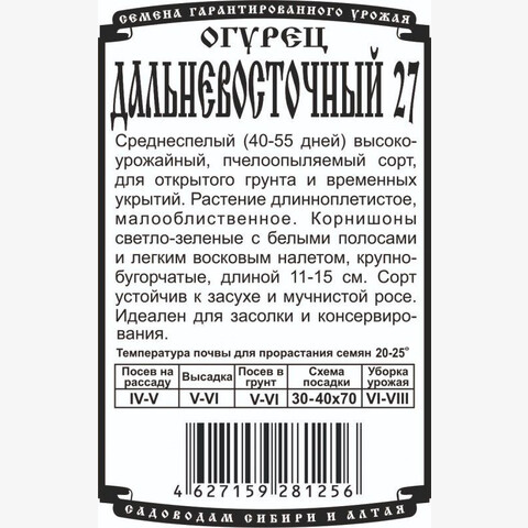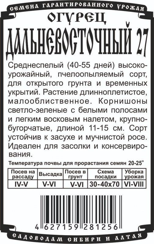 Среднеспелый (40-55 дней) высокоурожайный, пчелоопыляемый сорт, для открытого грунта и временных укрытий. Растение длинноплетистое, малооблиственное. Корнишоны светло-зеленые с белыми полосами и легким восковым налетом, крупнобугорчатые, длиной 11-15 см. Сорт устойчив к засухе и мучнистой росе. Идеален для засолки и консервирования.