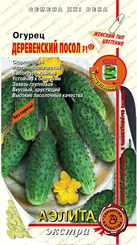 Огурец Деревенский посол F1 ®. Скороспелый высокоурожайный партенокарпический гибрид исключительно женского типа цветения для открытого грунта и пленочных теплиц. Гибрид устойчив к настоящей мучнистой росе, оливковой пятнистости, толерантен (не теряет урожайности и своих качеств) к пероноспорозу (ложной мучнистой росе). Растение среднеплетистое индетерминантное, склонное к пучковому образованию завязей (до 4-х зеленцов). Зеленец без горечи, хрустящий, крепкий, веретеновидный, крупнобугорчатый с частым расположением бугорков, зеленый, массой 90-110 г, длиной 11-13 см, диаметром 3-3,2 см, бурошипый. Вкусовые качества в свежем, консервированном виде, а также в засолке отличные. Гибрид рекомендован для консервирования, засолки и употребления в свежем виде. Компания «АЭЛИТА» является эксклюзивным продавцом гибрида огурца «Деревенский посол F1®» на рынке семян. Агротехника: Для огурца пригодны плодородные среднесуглинистые, воздухопроницаемые почвы. Хорошие предшественники - картофель, лук, капуста, перец. Огурцы выращивают, высевая семенами в грунт или через рассаду. Посев: на глубину 1,5-2 см при t° 25°C. Затем температуру понижают до 20°C. Семена высевают в грунт в конце мая при t° земли выше 13°C и t° воздуха выше 15°C. Высадка рассады: когда минует угроза заморозков. Плотность посадки 3-4 растения на 1 м2. Для выращивания на балконе потребуются: солнечное место, большие ящики с питательной почвосмесью и вертикальные опоры для плетей. Уход: растения укрывают пленкой, стебель направляют по шпалере. Для правильного развития растения нижние 4-5 завязей и 1-2 боковых побега прищипывают, последующие боковые побеги прищипывают над 2-ым листом. При поливе и подкормках: рекомендуем использовать удобрение «АЭЛИТА-ОВОЩНОЕ». Сбор урожая: в плодоношение вступает через 43-48 дней после массовых всходов. При многоразовой уборке общий товарный урожай составляет: в открытом грунте до 14 кг/м2, в закрытом до 23 кг/м2.