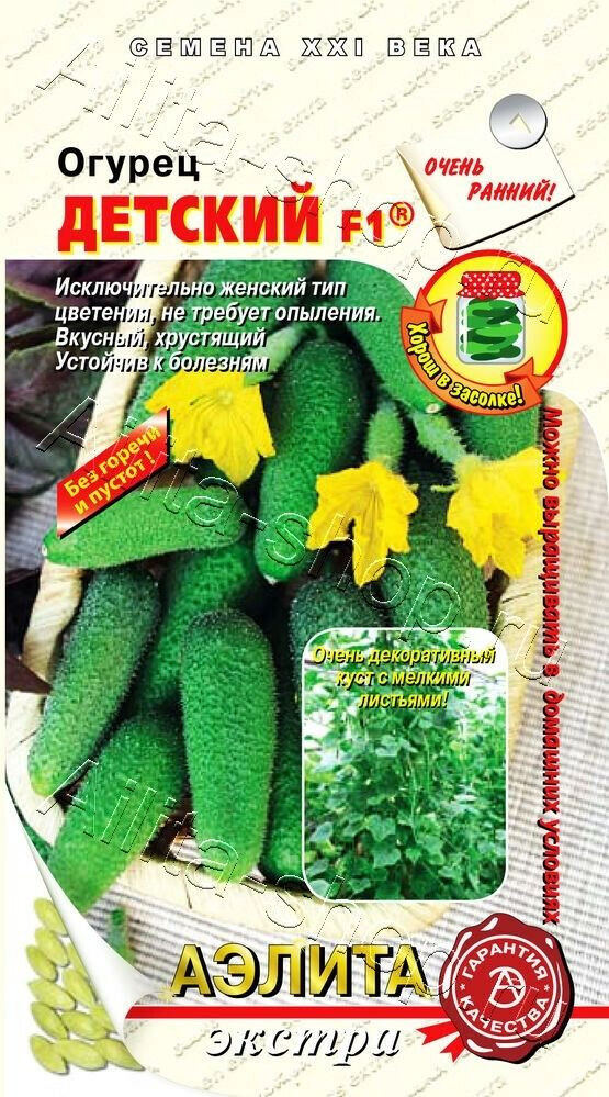 Очень интересная форма куста с длинными плетьми, покрытыми маленькими листьями. Во время цветения всё растение усеяно цветами, которые позже превращаются в миниатюрные огурчики. Такое растение будет радовать глаз как на участке, так и на балконе или лоджии. Гибрид раннеспелый партенокарпический, исключительно женского типа цветения для открытого грунта и пленочных теплиц, не требует опыления пчёлами. Гибрид устойчив: к вирусу огуречной мозаики, к настоящей и ложной мучнистой росе, к оливковой пятнистости, мишеневидной пятнистости листьев, к вирусу пожелтения жилок огурца. Зеленцы миниатюрные цилиндрические, мелко бугорчатые, ярко-зеленые, белошипые, не склонны к перерастанию, хрустящие, массой 65-70 г, длиной 8,5 см. Вкусовые качества зеленцов отличные, горечь отсутствует. Гибрид рекомендован для консервирования, засолки и употребления в свежем виде. Компания «АЭЛИТА» является эксклюзивным продавцом гибрида огурца «Детский F1®» на рынке семян.