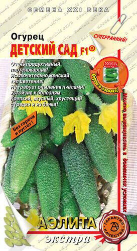 Огурец Детский сад F1 ®. Новый суперранний партенокарпический гибрид исключительно женского типа цветения для открытого грунта, пленочных и стеклянных теплиц. Не требует опыления пчёлами. Отличается повышенной урожайностью, долгим периодом плодоношения, отличным вкусом без горечи и качеством зеленцов. Устойчив к основным болезням огурца: вирусу огуречной мозаики, настоящей мучнистой росе, оливковой пятнистости, высоко толерантен к ложной мучнистой росе. Среднеплетистый. Корнишоны мелкобугорчатые, опушение белое, частое, цилиндрической формы, насыщенно-зеленые. Масса зеленца 64-83 г, длина 7-9,5 см, соотношение длины к диаметру – 3,1:1. Рекомендован для употребления в свежем виде, консервирования и засолки. Компания «АЭЛИТА» является эксклюзивным продавцом семян гибрида огурца «Детский сад F1®». Агротехника: Для огурца пригодны плодородные среднесуглинистые, воздухопроницаемые почвы. Хорошие предшественники - картофель, лук, капуста, перец. Огурцы выращивают, высевая семенами в грунт или через рассаду. Посев: на глубину 1,5-2 см при t° 25°C. Затем температуру понижают до 20°C. Семена высевают в грунт в конце мая при t° земли выше 13°C и t° воздуха выше 15°C. Высадка рассады: когда минует угроза заморозков. Плотность посадки 3-4 растения на 1 м2. Для выращивания на балконе потребуются: солнечное место, большие ящики с питательной почвосмесью и вертикальные опоры для плетей. Уход: растения укрывают пленкой, стебель направляют по шпалере. Для правильного развития растения нижние 4-5 завязей и 1-2 боковых побега прищипывают, последующие боковые побеги прищипывают над 2-ым листом. При поливе и подкормках: рекомендуем использовать удобрение «АЭЛИТА-ОВОЩНОЕ». Сбор урожая: в плодоношение вступает через 42-47 дней после массовых всходов. При многоразовой уборке общий товарный урожай составляет: в открытом грунте до 15 кг/м2, в закрытом до 27 кг/м2.