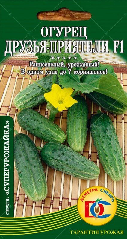Раннеспелый (37-39 дней) пчёлоопыляемый гибрид для открытого грунта и пленочных укрытий. Растение слаборослое, женского типа цветения, формирует в одном узле 2-7 плодов. Зеленцы-корнишоны овально-цилиндрические, крупнобугорчатые, черношипые, длиной 8-10 см, плотные, хрустящие. Рекомендован для консервирования и потребления в свежем виде.