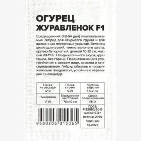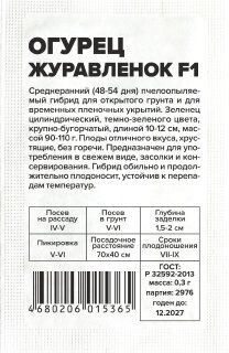 Среднеранний (48-54 дня) пчелоопыляемый гибрид для открытого грунта и для временных пленочных укрытий. Зеленец цилиндрический, темно-зеленого цвета, крупно-бугорчатый, длиной 10-12 см, массой 90-110 г. Плоды отличного вкуса, хрустящие, без горечи. Предназначен для употребления в свежем виде, засолки и консервирования. Гибрид обильно и продолжительно плодоносит, устойчив к перепадам температур. Место посадки: предпочитает плодородные рыхлые нейтральные почвы. Размещают после капусты, лука, бобовых. Не рекомендуется сеять после других растений семейства тыквенных (тыква, огурец, кабачок, арбуз) Освещение: обильное, переносит легкое затенение Предпосевная подготовка: семена замачивают в 0,5% растворе марганцовки на 15 минут. Допускается предварительное проращивание во влажной ткани или посев сухими семенами без подготовки. Инкрустированные (цветные) семена сеют сухим способом, без замачивания и подготовки Сроки посева: на рассаду за 20-25 дней до высадки (апрель-май), в открытый грунт после прогревания почвы до 15..18°С на глубине 15 см (май-июнь) Посев на рассаду: семена раскладывают на выровненный уплотненный теплый очень влажный грунт в рассадные ящики или индивидуальные емкости объемом 0,5 л. Присыпают слоем почвы 0,8-1 см и хорошо уплотняют, аккуратно поливают теплой водой, накрывают пленкой. Пророщенные семена присыпают рыхлым грунтом без уплотнения Посев в грунт: высевают, когда почва прогреется до 15-20°С. Семена раскладывают на уплотненной и хорошо увлажненной почве, заделывают землей на глубину 1,5-2,0 см, хорошо увлажняют, уплотняют и накрывают пленкой Пикировка/перевалка: высадка проводится в открытый грунт или хорошо проветриваемые теплицы с доступом насекомых – опылителей. Схема посадки 70х40 см Уход: растения прищипывают после 5-7 настоящего листа. Почва под растениями всегда должна оставаться увлажненной. Подкормки проводят при наличии симптомов дефицитов питания. При выращивании в теплице необходимо обеспечивать проветривание