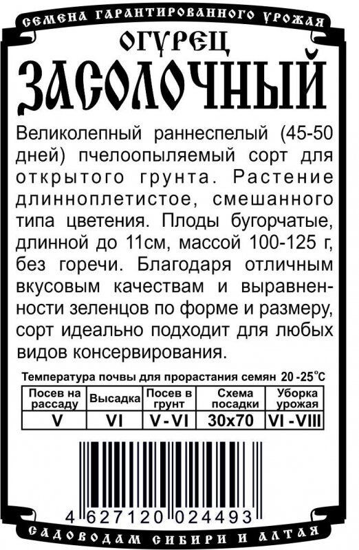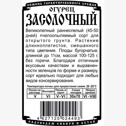 Великолепный раннеспелый (45-50 дней) пчелоопыляемый сорт для открытого грунта. Растение длинноплетистое, смешанного типа цветения. Зеленец бугорчатый, длинной до 11см, массой 100-125г, без горечи. Благодаря отличным вкусовым качествам и выравненности зеленцов по форме и размеру, сорт идеально подходит для любых видов консервирования.