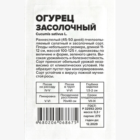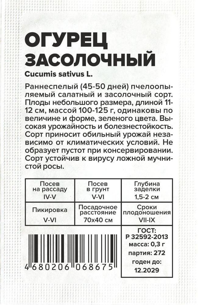 Раннеспелый (45-50 дней) пчелоопыляемый салатный и засолочный сорт. Плоды небольшого размера, длиной 11-12 см, массой 100-125 г, одинаковы по величине и форме, зеленого цвета. Высокая урожайность и болезнестойкость. Сорт приносит обильный урожай независимо от климатических условий. Не образует пустот при консервировании. Сорт устойчив к вирусу ложной мучнистой росы. Место посадки: предпочитает плодородные рыхлые нейтральные почвы. Размещают после капусты, лука, бобовых. Не рекомендуется сеять после других растений семейства тыквенных (тыква, огурец, кабачок, арбуз) Освещение: обильное, переносит легкое затенение Предпосевная подготовка: семена замачивают в 0,5% растворе марганцовки на 15 минут. Допускается предварительное проращивание во влажной ткани или посев сухими семенами без подготовки. Инкрустированные (цветные) семена сеют сухим способом, без замачивания и подготовки Сроки посева: на рассаду за 20-25 дней до высадки (апрель-май), в открытый грунт после прогревания почвы до 15..18°С на глубине 15 см (май-июнь) Посев на рассаду: семена раскладывают на выровненный уплотненный теплый очень влажный грунт в рассадные ящики или индивидуальные емкости объемом 0,5 л. Присыпают слоем почвы 0,8-1 см и хорошо уплотняют, аккуратно поливают теплой водой, накрывают пленкой. Пророщенные семена присыпают рыхлым грунтом без уплотнения Посев в грунт: высевают, когда почва прогреется до 15-20°С. Семена раскладывают на уплотненной и хорошо увлажненной почве, заделывают землей на глубину 1,5-2,0 см, хорошо увлажняют, уплотняют и накрывают пленкой Пикировка/перевалка: высадка проводится в открытый грунт или хорошо проветриваемые теплицы с доступом насекомых – опылителей. Схема посадки 70х40 см Уход: растения прищипывают после 5-7 настоящего листа. Почва под растениями всегда должна оставаться увлажненной. Подкормки проводят при наличии симптомов дефицитов питания. При выращивании в теплице необходимо обеспечивать проветривание