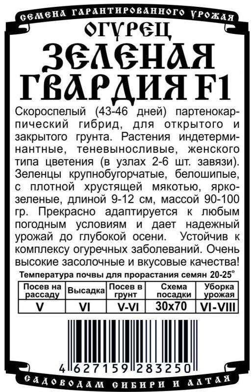 Скороспелый (43-46 дней) партенокарпический гибрид, для открытого и закрытого грунта. Растения индетерминантные, теневыносливые, женского типа цветения (в узлах 2-6 шт завязи). Зеленцы крупнобугорчатые, белошипые, с плотной хрустящей мякотью, ярко-зеленые, длиной 9-12 см, массой 90-100 гр. Прекрасно адаптируется к любым погодным условиям и дает надежный урожай до глубокой осени. Устойчив к комплексу огуречных заболеваний. Очень высокие засолочные и вкусовые качества!