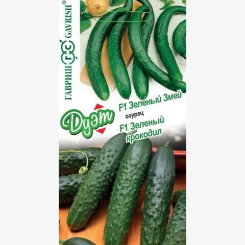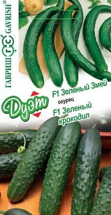 Огурец F1 Зеленый крокодил. Среднеспелый (50-57 дней от всходов до плодоношения) пчелоопыляемый гибрид смешанного типа цветения. Для выращивания в открытом грунте и в теплицах, под временными пленочными укрытиями. Зеленец цилиндрической формы, длиной до 22 см, массой 170-200 г, темно-зеленый со светлыми полосками, крупнобугорчатый, опушение сложное, шипы белые. Гибрид отличается высокой урожайностью, хорошими вкусовыми качествами, а также повышенной теневыносливостью растений. Посев на рассаду — в начале мая. Высадка в грунт — в конце мая-начале июня в фазе двух-трех настоящих листьев. Посев непосредственно в теплицу проводится в конце мая-начале июня. Схема посадки: 40х40 см.