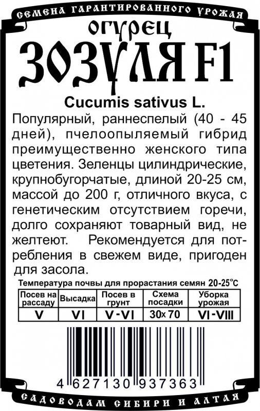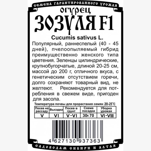 Популярный, раннеспелый (40 - 45 дней), пчелоопыляемый гибрид преимущественно женского типа цветения. Зеленцы цилиндрические, крупнобугорчатые, длиной 20-25 см, массой до 200 г, отличного вкуса, с генетическим отсутствием горечи, долго сохраняют товарный вид, не желтеют. Рекомендуется для потребления в свежем виде, пригоден для засола.