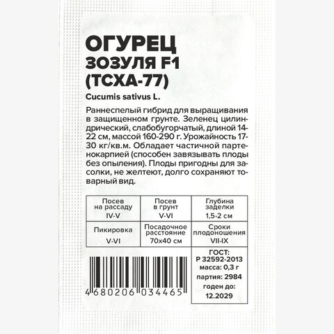 Один из самых популярных раннеспелых гибридов для выращивания в защищенном грунте. Зеленец цилиндрический, слабо-бугорчатый, длиной 14-22 см, массой 160-290 г. Урожайность 17-30 кг/кв.м. Обладает частичной партенокарпией (способен завязывать плоды без опыления). Плоды пригодны для засолки, не желтеют, долго сохраняют товарный вид. Место посадки: предпочитает плодородные рыхлые нейтральные почвы. Размещают после капусты, лука, бобовых. Не рекомендуется сеять после других растений семейства тыквенных (тыква, огурец, кабачок, арбуз) Освещение: обильное, переносит легкое затенение Предпосевная подготовка: семена замачивают в 0,5% растворе марганцовки на 15 минут. Допускается предварительное проращивание во влажной ткани или посев сухими семенами без подготовки. Инкрустированные (цветные) семена сеют сухим способом, без замачивания и подготовки Сроки посева: на рассаду за 20-25 дней до высадки (апрель-май), в открытый грунт после прогревания почвы до 15..18°С на глубине 15 см (май-июнь) Посев на рассаду: семена раскладывают на выровненный уплотненный теплый очень влажный грунт в рассадные ящики или индивидуальные емкости объемом 0,5 л. Присыпают слоем почвы 0,8-1 см и хорошо уплотняют, аккуратно поливают теплой водой, накрывают пленкой. Пророщенные семена присыпают рыхлым грунтом без уплотнения Посев в грунт: высевают, когда почва прогреется до 15-20°С. Семена раскладывают на уплотненной и хорошо увлажненной почве, заделывают землей на глубину 1,5-2,0 см, хорошо увлажняют, уплотняют и накрывают пленкой Пикировка/перевалка: в остекленные или пленочные теплицы, тоннели высаживают 20-25-дневную рассаду, имеющую 3-5 настоящих листьев. Схема посадки 70х40 см с использованием шпалер Уход: почва под растениями всегда должна оставаться увлажненной. Подкормки проводят при наличии симптомов дефицитов питания. При выращивании в теплице необходимо обеспечивать проветривание. Не требуют формировки