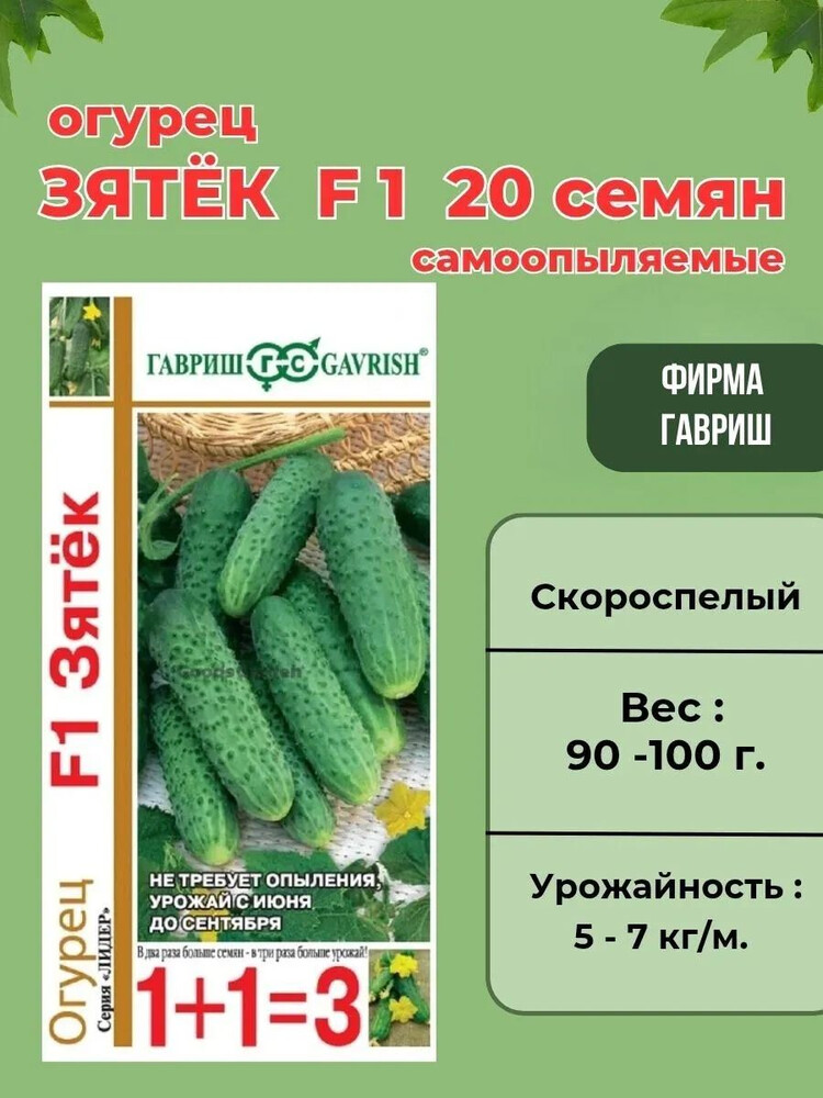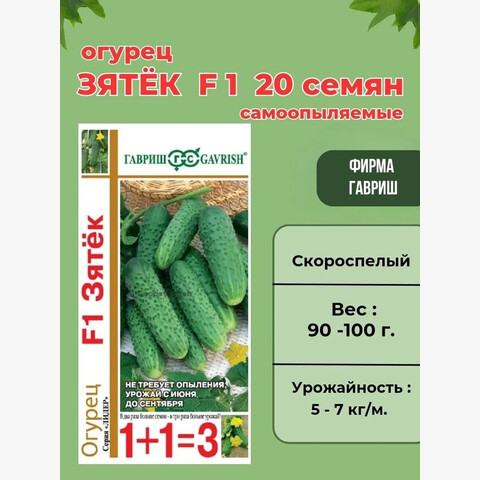 Скороспелый (45-48 дней от всходов до плодоношения) партенокарпический гибрид женского типа цветения для выращивания в открытом грунте и пленочных теплицах. Зеленец длиной 10-12 см, диаметром 3,0-3,5 см, массой 90-100 г, частобугорчатый, белошипый, без горечи. Можно собирать на пикули и корнишоны. Окраска плода темно-зеленая со светлыми полосами. В пазухе листьев образуется 2-4 завязи (до 6-8 штук). Использование плодов универсальное (в свежем виде, засолка, маринование). Гибрид устойчив к корневым гнилям, настоящей мучнистой росе, вынослив к ложной мучнистой росе. Урожайность одного растения 5,0-7,0 кг. Посев на рассаду — в конце апреля. Высадка в грунт — в конце мая-начале июня в фазе 3-4-х настоящих листьев. Посев непосредственно в теплицу — в середине мая. Схема посадки: 50х50 см.