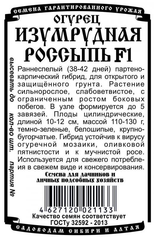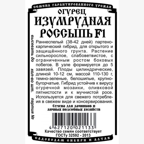 Раннеспелый (38-42 дней) партенокарпический гибрид (R), для открытого и защищённого грунта. Растение сильнорослое, слабоветвистое, с ограниченнымтипом роста боковых побегов. В узле формируется 2-3 завязи. Плоды цилиндрические, длиной 10-12 см, массой 110-130 г, темно-зеленые, белошипые, крупнобугорчатые. Гибрид устойчив к вирусу огуречной мозаики, оливковой пятнистости и толерантен к мучнистой росе. Используется для свежего потребления и консервирования.