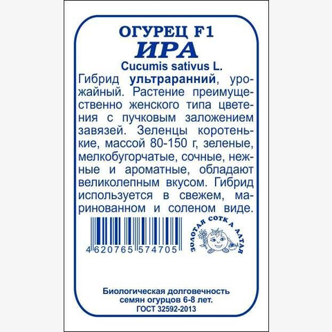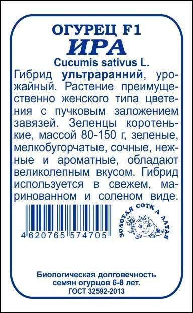 Гибрид ультраранний, урожайный. Растение преимущественно женского типа цветения с пучковым заложением завязей. Зеленцы коротенькие, массой 80-150 г, зеленые, мелкобугорчатые, сочные, нежные и ароматные, обладают великолепным вкусом, не горчат. Гибрид прекрасно подходит для приготовления салатов, засолки и маринования.