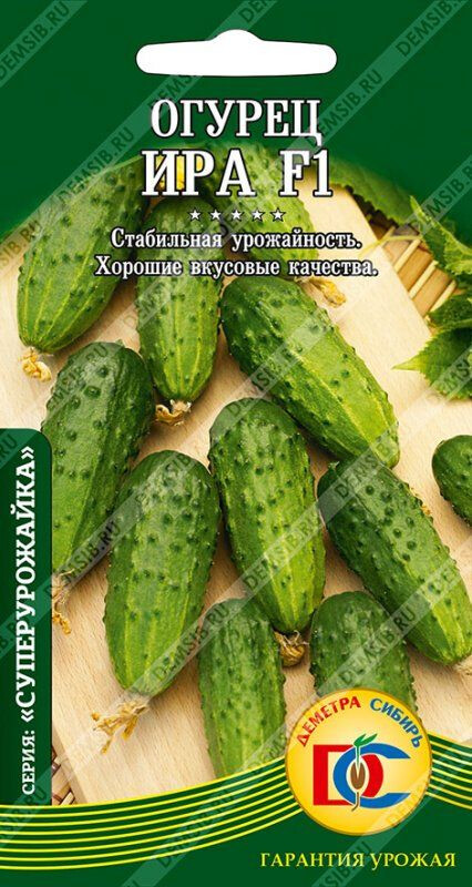 Раннеспелый (40-50 дней) пчелоопыляемый гибрид для открытого грунта. Растение среднеплетистое, с пучковым образованием завязей (в одном узле 2-3 плода). Зеленец темно-зеленый, длиной 12-15см, редкобугорчатый, отличного вкуса, рекомендован для потребления в свежем виде и приготовления зимних заготовок.