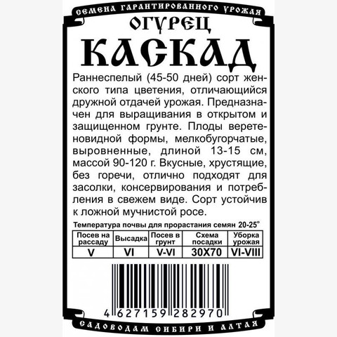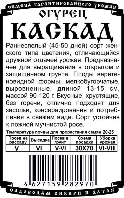 Раннеспелый (45-50 дней) сорт женского типа цветения, отличающийся дружной отдачей урожая. Предназначен для выращивания в открытом и защищенном грунте. Плоды веретеновидной формы, мелкобугорчатые, выровненные, длиной 13-15 см, массой 90-120 г. Вкусные, хрустящие, без горечи, отлично подходят для засолки, консервирования и потребления в свежем виде. Сорт устойчив к ложной мучнистой росе.
