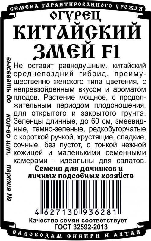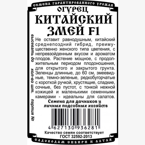 Не оставит равнодушным, китайский среднепоздний гибрид, преимущественно женского типа цветения, с непревзойденным вкусом и ароматом плодов. Растение мощное, с продолжительным периодом плодоношения, для открытого и закрытого грунта. Зеленцы длинные, до 60 см, змеевидные, темно-зеленые, редкобугорчатые с короткой ручкой, хрустящие, сладкие, сочные, без пустот, с тонкой нежной кожицей и маленькими семенными камерами - идеальны для салатов.