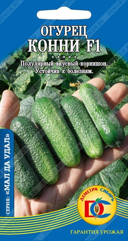 • Популярный, раннеспелый (47-50 дней), партенокарпический гибрид для открытого грунта и теплиц. Растение мощное. Женского типа цветения, с пучковым образованием завязи. Зеленцы темно-зеленые, мелкобугорчатые, с белым опушением, корнишон длиной 7-9 см, массой 60-80 г, отличного вкуса, без горечи. Рекомендуется для потребления в свежем виде, пригоден для засола. Отличается устойчивостью к болезням и продолжительным периодом плодоношения.